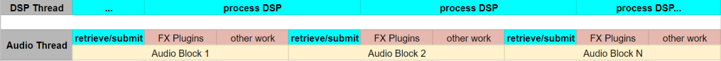 In Osirus, we do exactly that. We tell the DSP thread when its time to process a block of audio data and at the same time, we retrieve the previous work that the DSP thread must have finished processing by now.