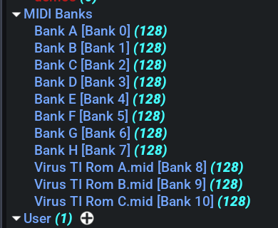 All data sources with assigned bank numbers appear in a dedicated MIDI Banks group in the Patch Manager tree, sorted by bank number. This gives you a quick overview of your current bank layout without having to navigate through the full data source tree.