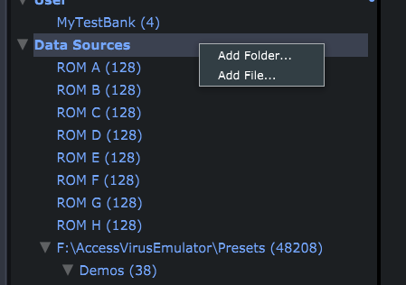 Patches are provided by various Data Sources. Where applicable, ROM/factory presets are automatically added (not for Waldorf or Nord synths due to the way they work in the hardware). Additional patches from disk can be added via right-click on the Data Sources node — select a file or even a whole folder to add it to the database. Folders are scanned recursively, so you can point it at your entire preset collection.