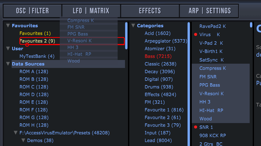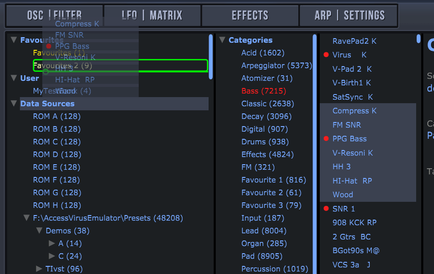 - Tag filtering — Click on categories, tags, or favourites in the tree to filter the patch list