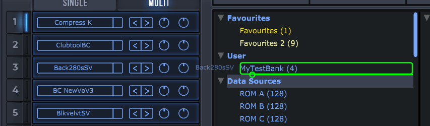 User Banks allow you to save and organize your custom patches. Create a User Bank by right-clicking on User and selecting Create, then add patches by dragging them from the patch list into the User Bank.
