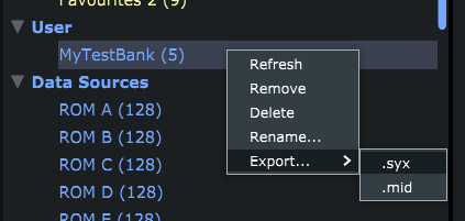 To export a User Bank for use with hardware, right-click to show the context menu and choose your export format (.syx or .mid).